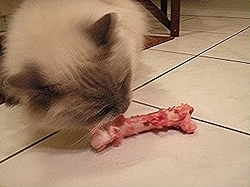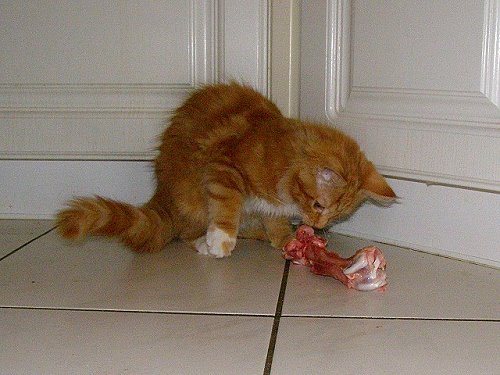 Dabei ist zu sagen, dass nicht alles davon verkehrt ist. Knochen und Blut z.B. enthalten Mineralien und Salze, die die Katze braucht. Auch frißt die Katze in der Natur Krallen, Schnäbel u.ä. in kleinen Mengen mit.