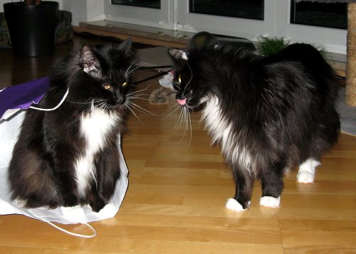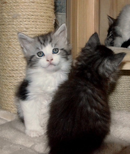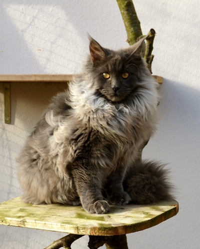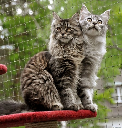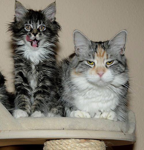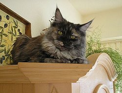 Gerade die Maine Coon ist eine sehr gesellige Katzenrasse, so daß es bei Wohnungshaltung für mich unabdingbar ist, Katzen nur zu zweit oder mehreren zu halten. Was immer wir auch tun, eine andere Katze können wir doch nicht wirklich ersetzen und die Wohungskatze kann ohne eine zweite Katze nie ihre typischen kätzischen interaktiven Verhaltensweisen ausleben.